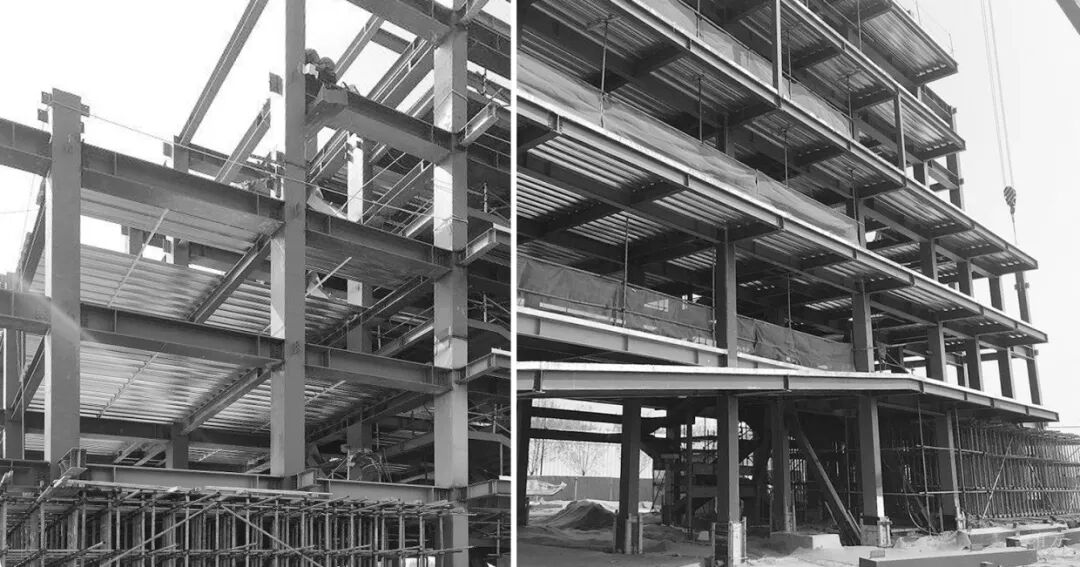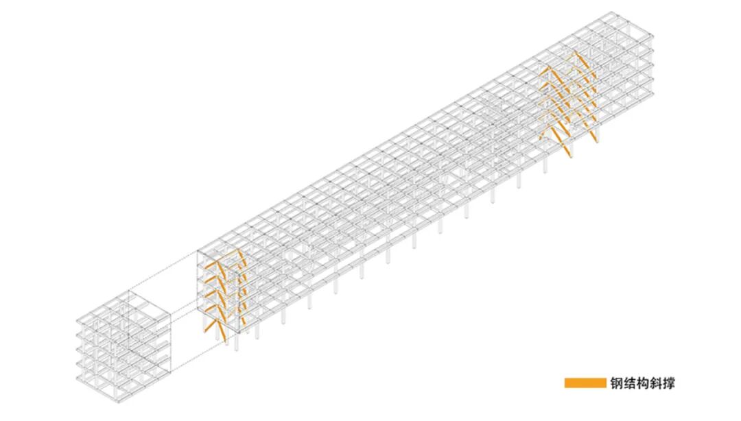 从悬挑结构的实现角度出发,如果能在楼层之间增加斜拉杆,整个悬挑区域通过桁架体系便能解决。但是建筑的两端全是客房,如果增加了斜杆,将影响客房的使用。结构设计师建议直接利用框架受力。施工时在抽柱的底部设置满堂脚手架,钢柱钢梁在脚手架上进行拼装,并浇筑混凝土楼面,等整个结构体系形成之后,再拆除脚手架。