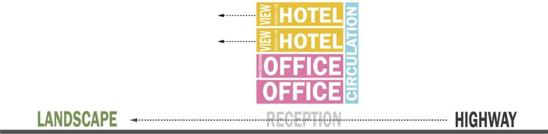 方案将内部交通等服务性空间布置在西侧,将主要的使用空间布置在东侧景观面,加强和湿地公园、运动公园和阿那亚海岸社区的视觉关联。交通空间在满足使用功能的同时也一定程度上隔绝了西侧城市道路的噪音,保证东侧使用空间的舒适性。