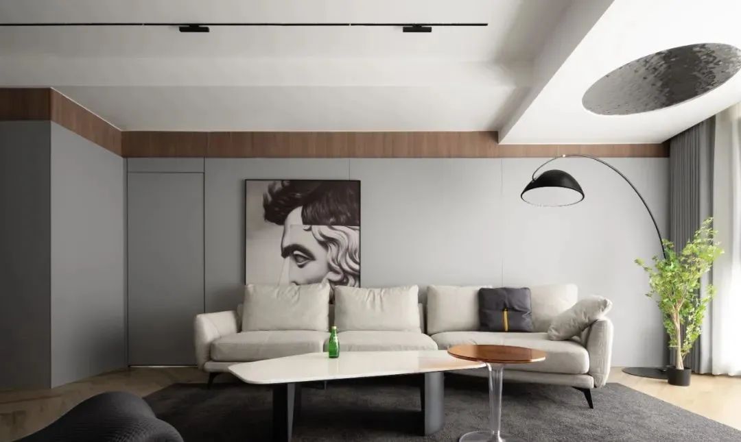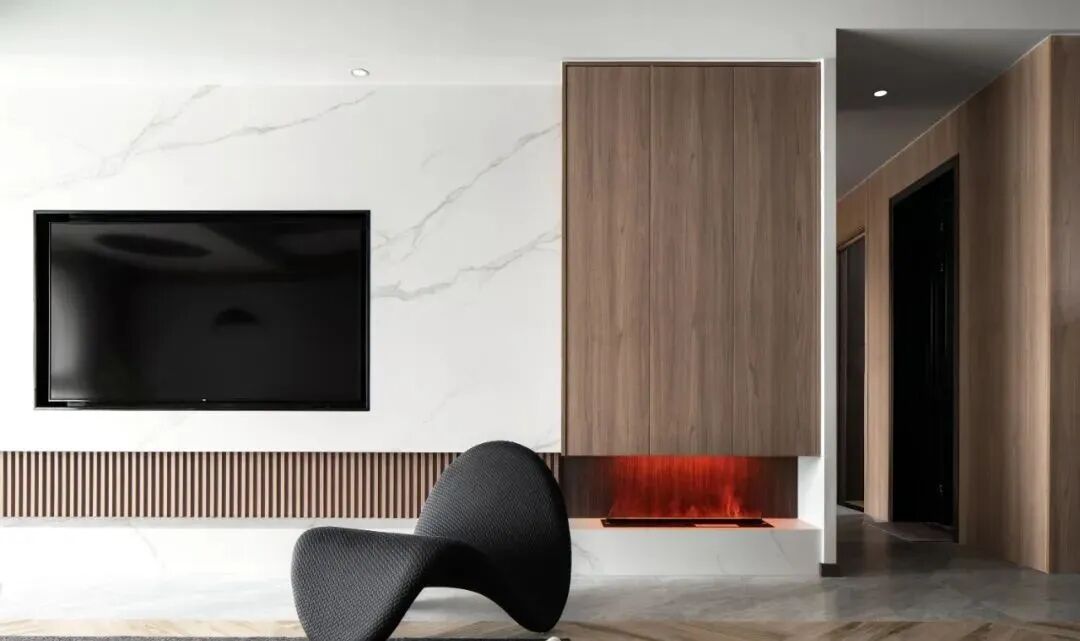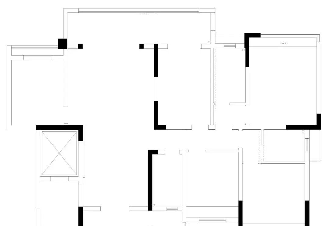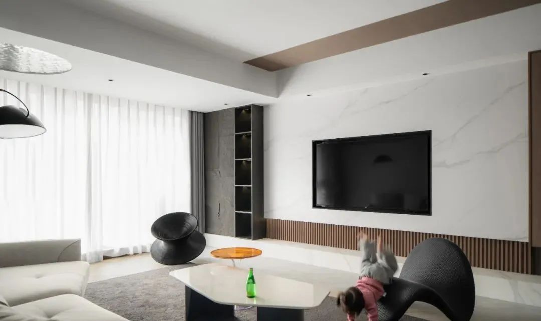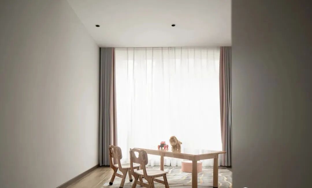本案是一套面积为157平米的大平层,屋主一家六口居住,要满足一家人的储物需求,除衣柜外将客厅电视墙、玩耍区入户都利用墙面来增加收纳。设计师还通过户型的优化改造使户型更加方正合理。