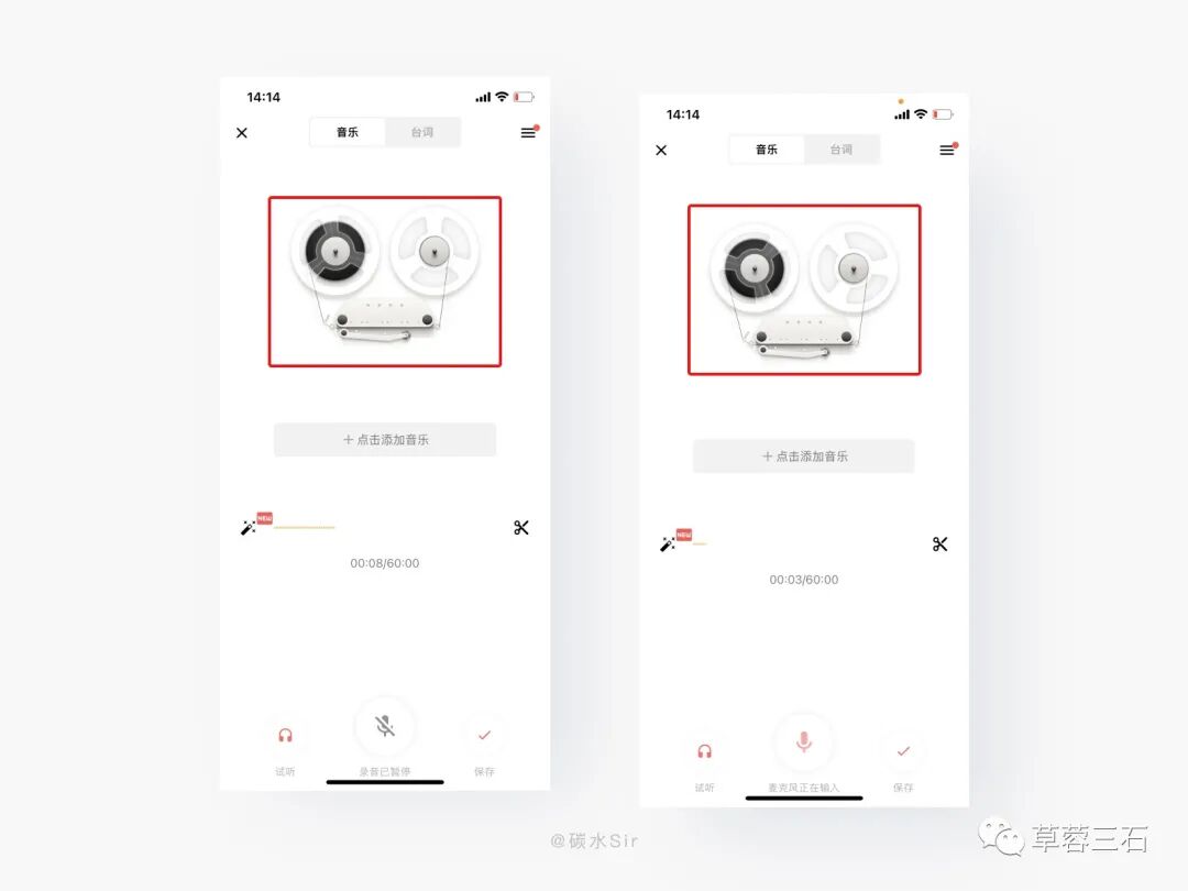 设计方案:在我的-进入录声音模块中,头图展示一个录音磁带机,当开启录音功能时,磁带机会进行旋转播放,左慢右快的展示形式符合真实机器的运动规律,给用户强提醒告知用户此时正在录音中,当暂停时,磁带机及时停止,和按钮形成触发绑定,提高产品使用体验。