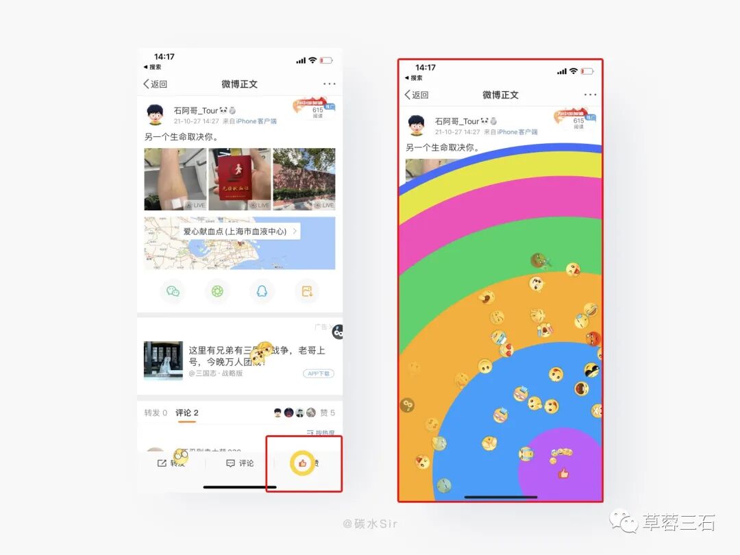 设计方案:在微博单条动态页面中,对“赞”进行点击一次操作是普通点赞反馈;长按触发连赞机制,会带来多彩多图标的更强的视觉感受,带来强烈的情感反馈,让用户尽情的释放情绪,得到内在解压。
