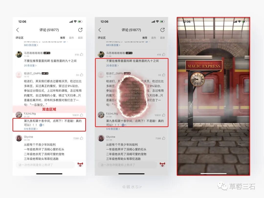 设计方案:哈利波特音乐中,在评论区第九和第十条中间分割线处,点击两下!触发魔法视频,把用户带入情境之中,勾起满满的回忆,配合音乐声音,真可谓视觉听觉双重享受。