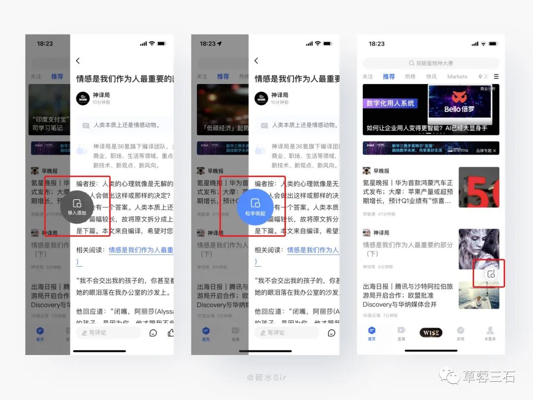 值得学习的是,左滑浮窗图形随着手势上下位置进行移动,路径更短更快的进行操作,提高用户使用体验。因为隐藏式的交互有一定学习成本,产品充分考虑到这点,在文章右上角更多按钮中放置加入浮窗功能,两个激活入口,兼容新老用户使用,提高产品易用性。