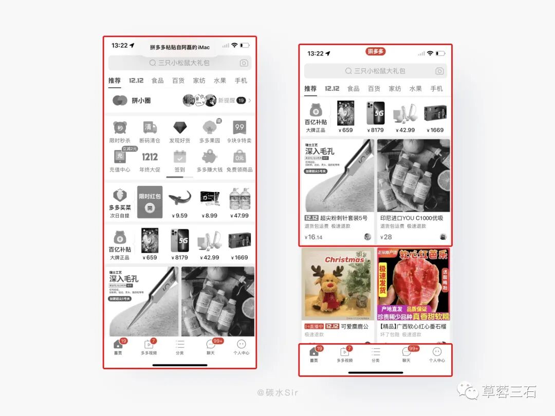拼多多首屏灰度展示,因为本身业务模块整合精炼,首屏会展示商品内容,再次情况下,为了让首屏视觉灰度统一,给用户统一感,一屏显示的两个商品都去色展示,包括价格和头像等。