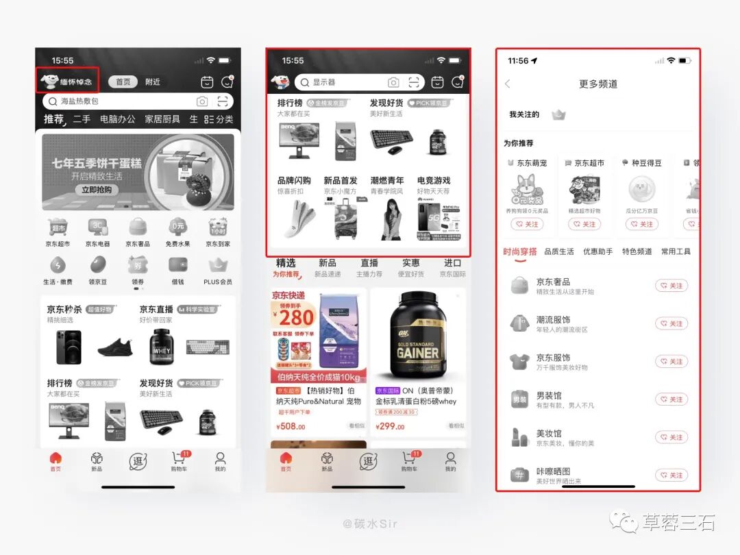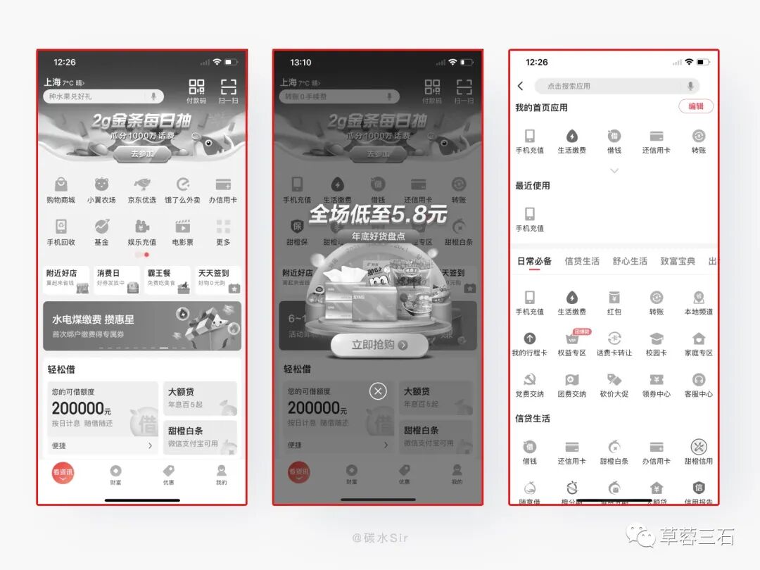 金刚区与导航去色:首页视觉呈现断层,搜索金刚区入口需要看字来寻找,视觉感知平级,品牌感知较弱。