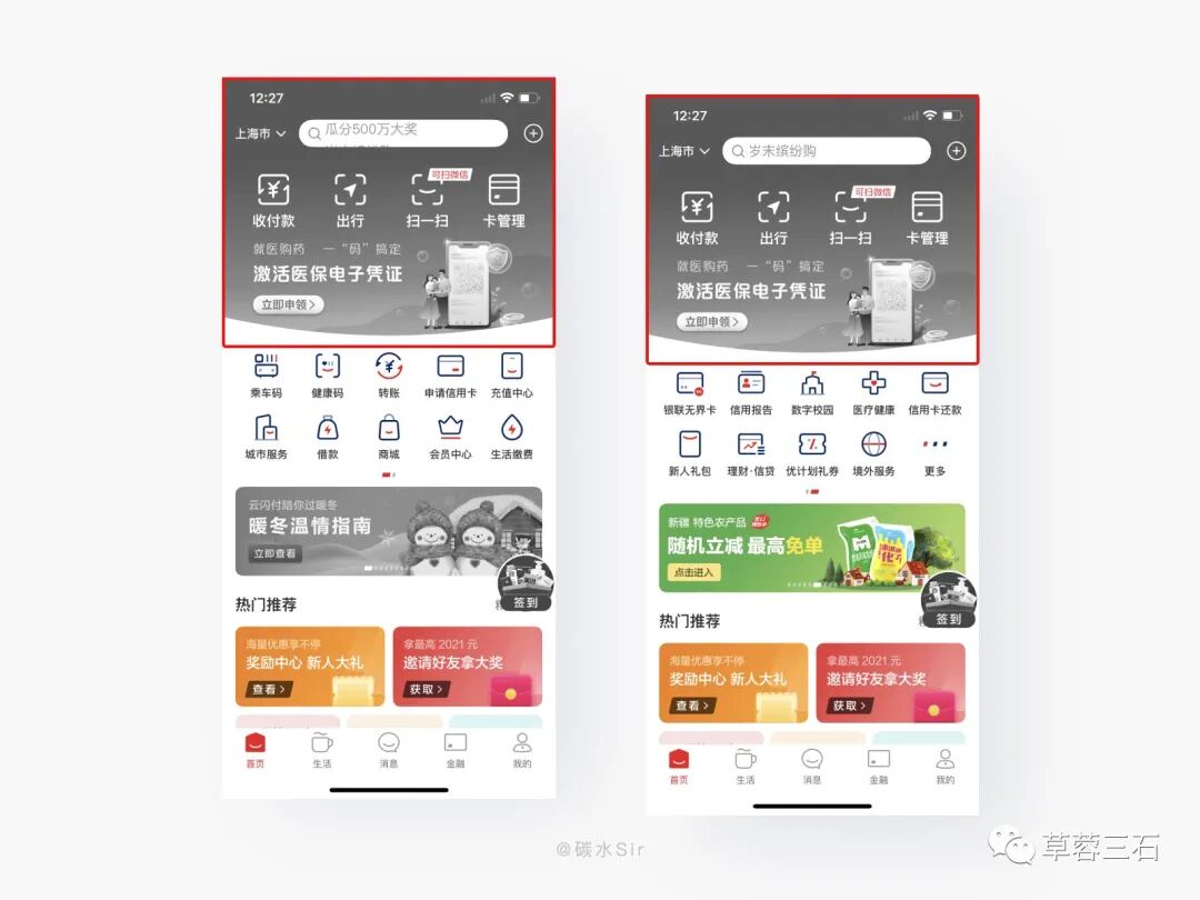 红色在中国更多具有喜庆热闹活跃的感受,不利于特殊节日使用。云闪付作为品牌红会与节日发生冲突。在首页顶部导航中采用去色的表现形式,一来降低色彩与场景的对比,二来体现产品对节日的特殊缅怀,三来降低饱和度会凸显金刚区业务板块,侧面还能提升各业务的曝光,是不错的方案设计。