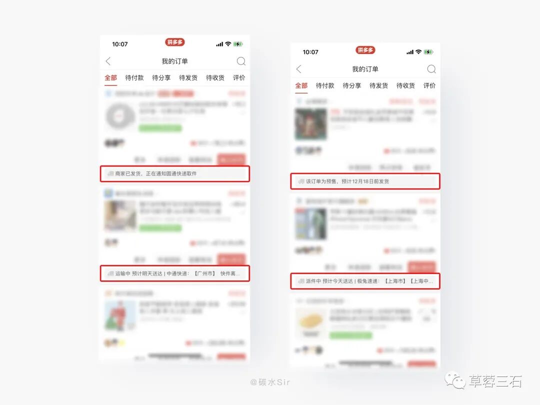 设计方案:在「拼多多」买了很多商品,查看订单状态,只需在「个人中心」-「我的订单中」就可快速查看到所有订单的物流信息。在设计思路中,把单个商品物流信息由原来的二级页面放到订单页中,对应每个商品下方展示该商品的物流信息,对于开发成本来说是容易的,对用户来说也是更高效,更好的体验亮点。