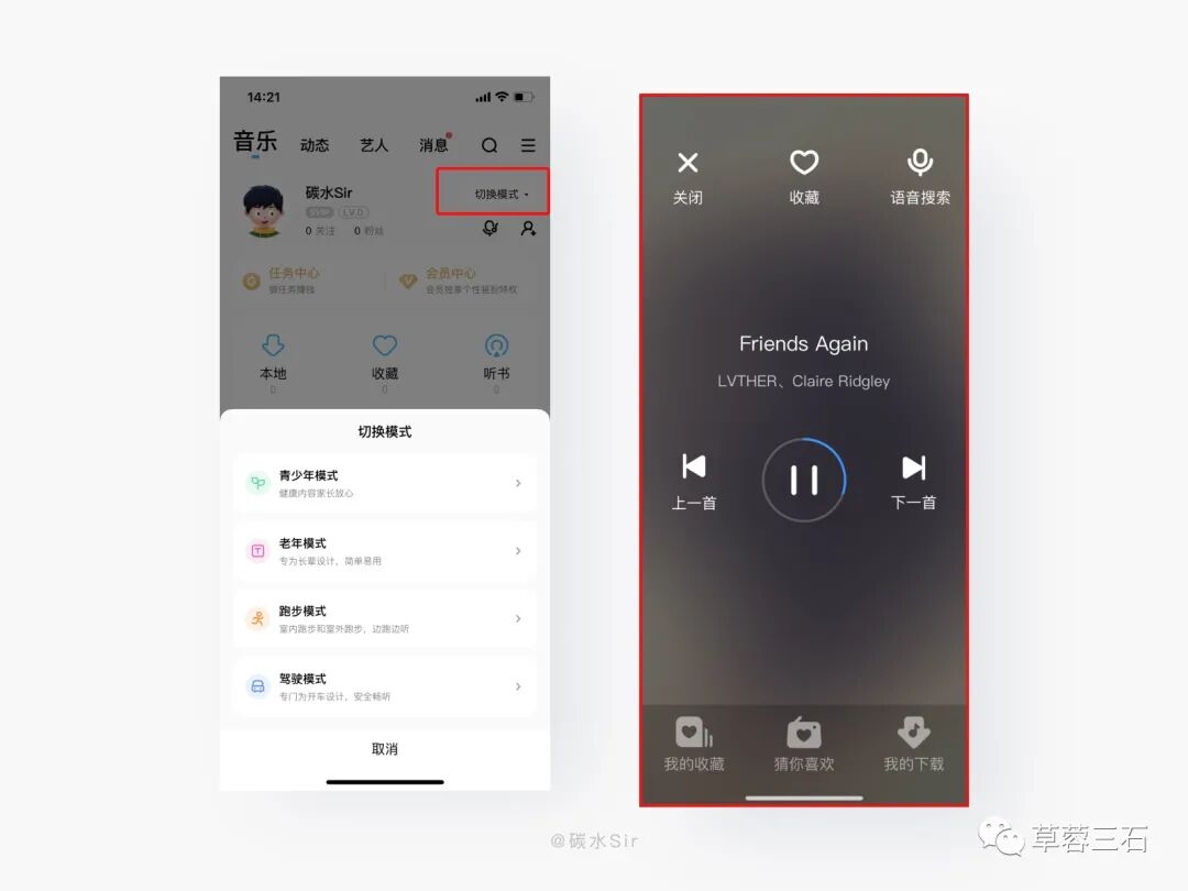 设计方案:音乐产品的使用场景和受众人群,提炼出四种模式,分别:青少年模式、老年模式、跑步模式、驾驶模式,用户在「我的页面」点击「切换模式」快速切换,相比在设置页面放置「切换模式」,前置操作更加便捷,使用体验更加友好。我选择「跑步模式和驾驶模式」显示页面都是大字大图标展示,根据「菲茨定律」按钮更大更易点击、且交互时间越短,有利于老年人及驾驶员操作使用。