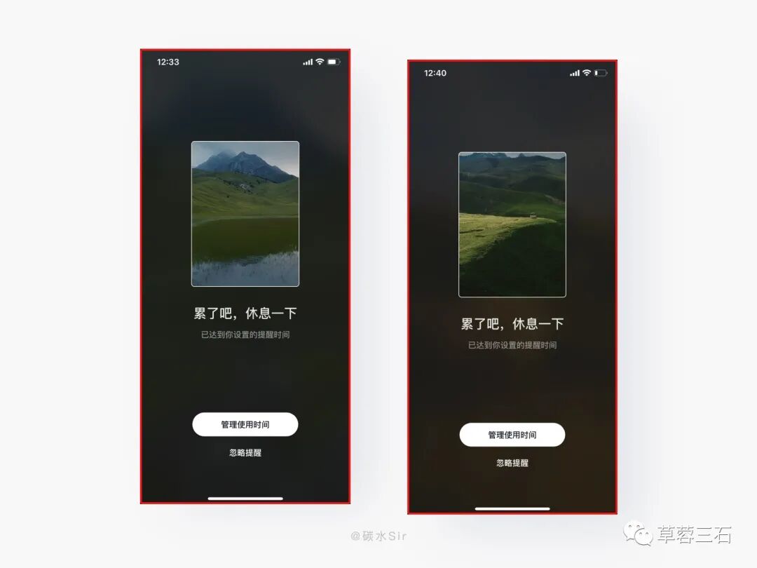 设计方案:当用户在设置了休息提醒,达到设置时间时,视频会自动弹出深色白噪音页面(缓解切换页面的不适感),配有绿色草原图片(绿色保护眼睛的颜色),加上醒目的文案(强提醒),清晰的自然声音(放松舒缓)。让用户停下来休息一下。这个功能的设计让用户自律作息时间,同时让用户内在感受到产品的正向情感,并不是冷冰冰只会消费用户时间的产品。
