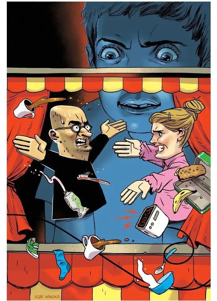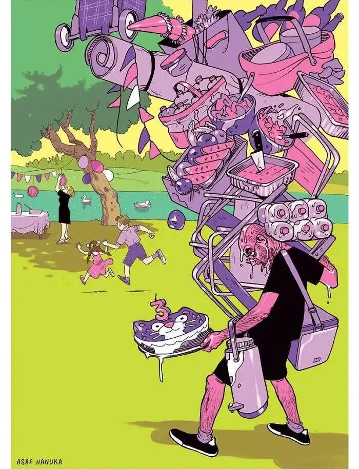之所以称他的作品为写实主义,就是因为每一幅插图都太真实了,他捕捉到了我们生活的方方面面,职场、育儿、两性、社交等等,都是我们正在经历的真实人生。乍看阿萨夫·哈努卡的作品,会让人感到有一些压抑,因为艺术家并不是在描绘一个童话,而是以一种比较暗黑的形式,来传递现实基调,当你真的看懂了他的漫画,其实也是看懂了人性。