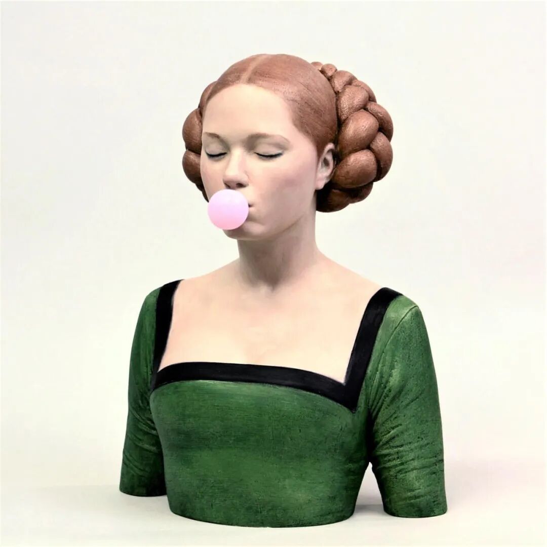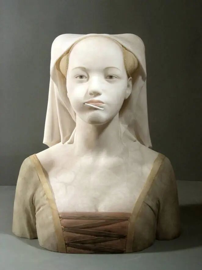 试想一下,如果文艺复兴,甚至更早时期的女性,具有当代流行文化的一些行为特征,会是怎样的画面?杰拉德·马斯给出了答案,在他的现实主义大理石雕塑中,不仅具有14、15世纪的审美情趣,还融入了许多俏皮可爱的元素。