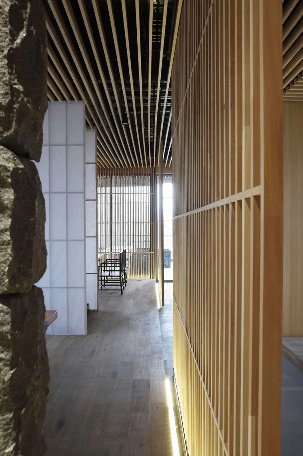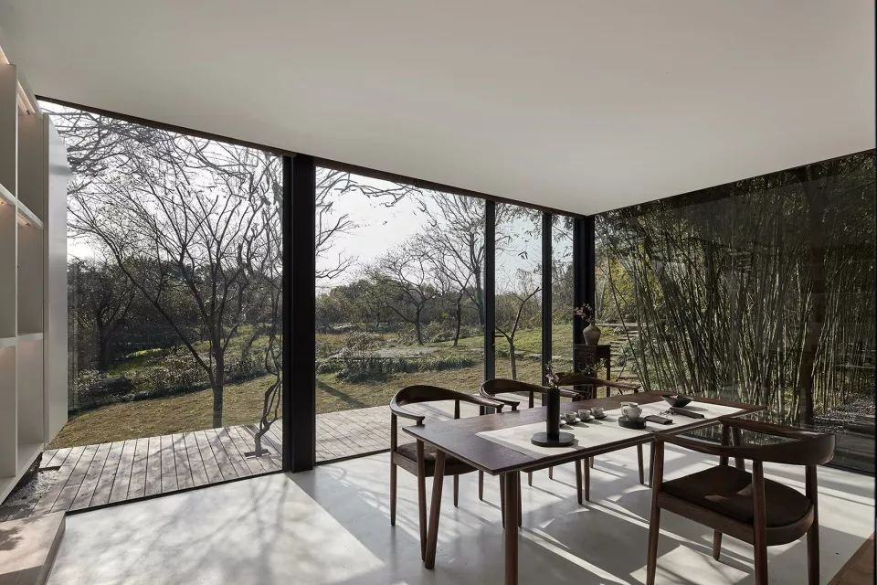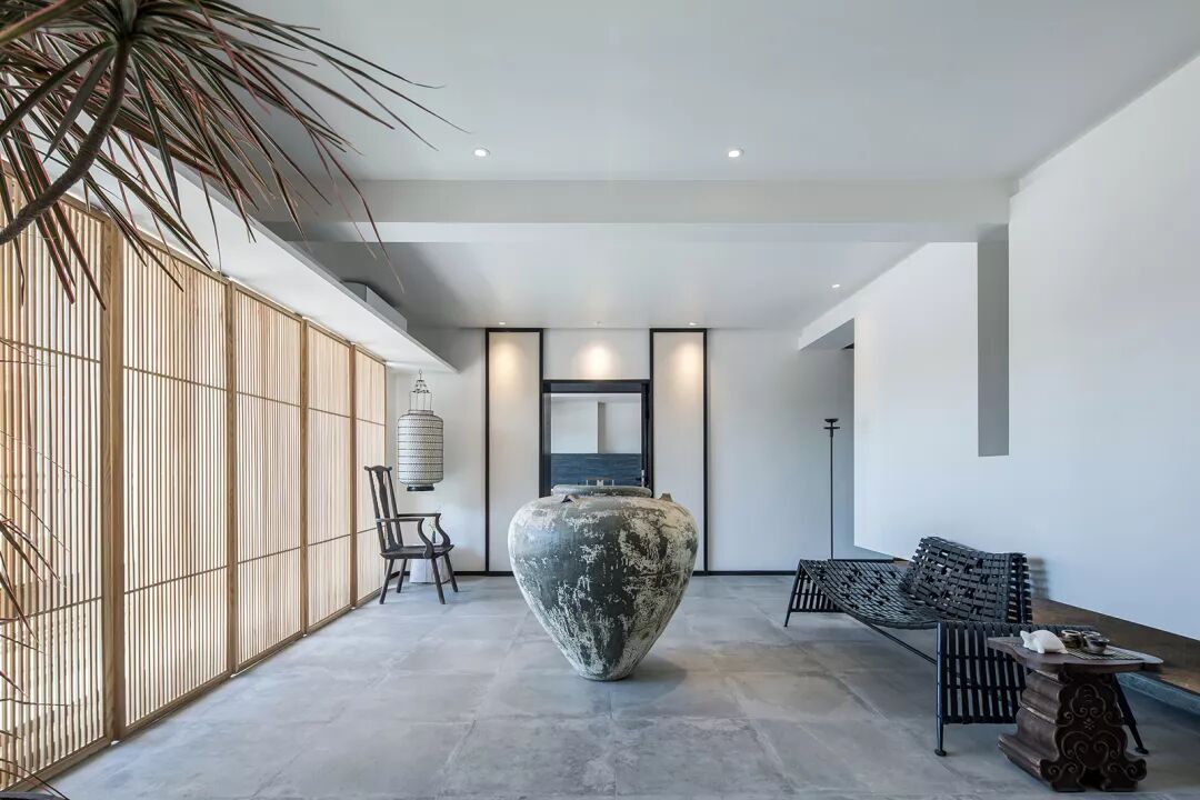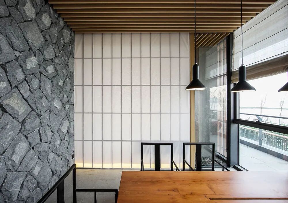 茶会所临江而设,客人需沿着公园小径绕过建筑外围来到主入口。整体布局于对称中表达丰富内涵。大石头装置立于碎石子铺就的地面之上,引发观者对自然生息、生命轮回问题的思考。端景的设计不仅丰富了室内的景致,而且增添了空间的层次感和温润灵动的尺度感。