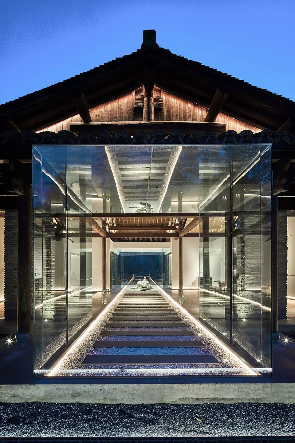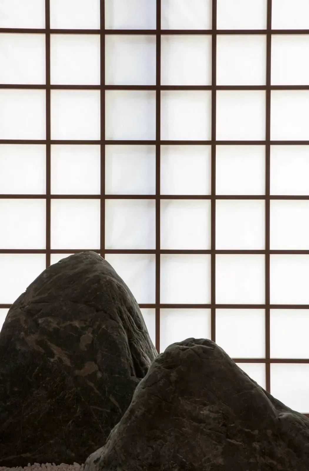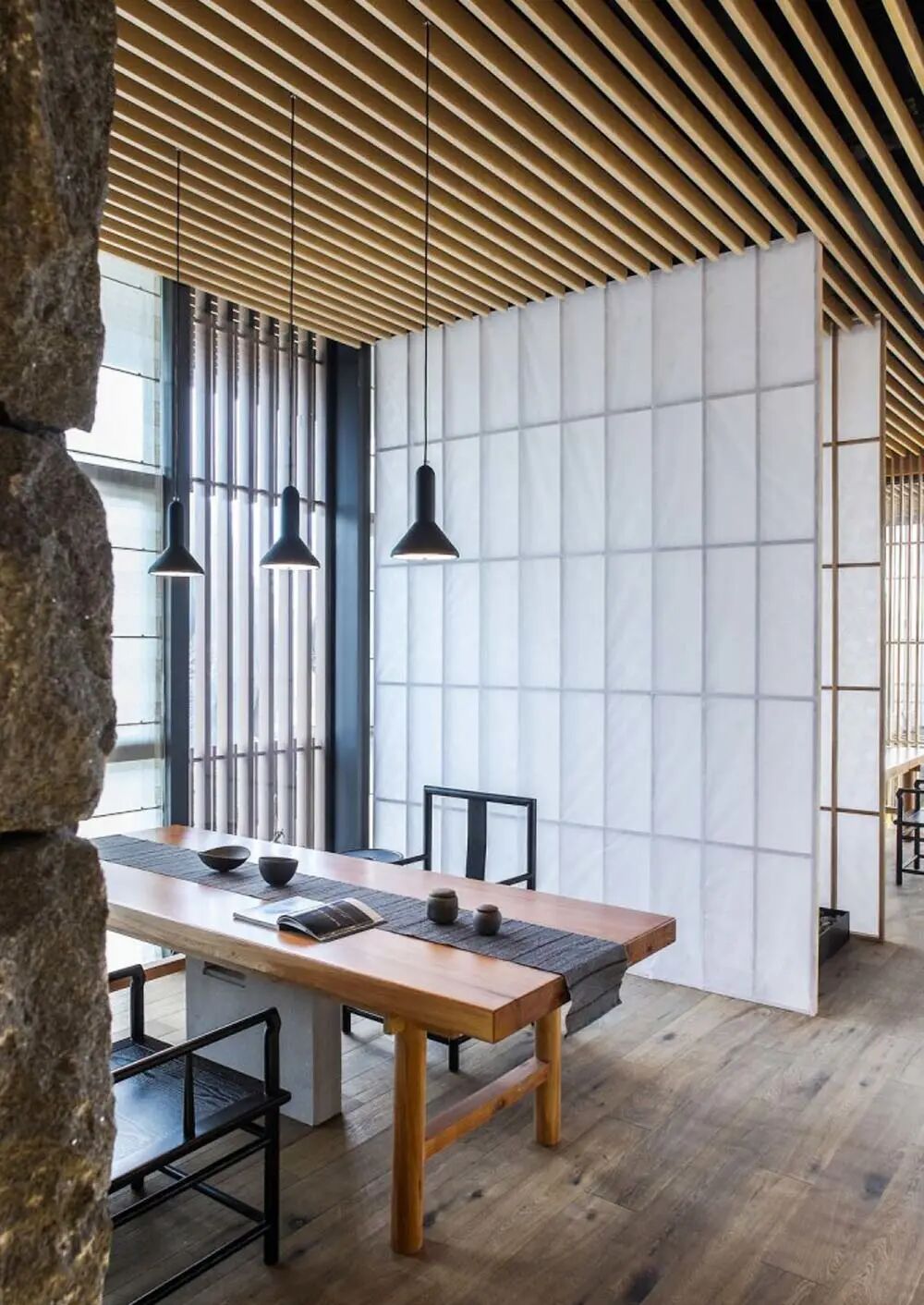 茶会所临江而设,客人需沿着公园小径绕过建筑外围来到主入口。整体布局于对称中表达丰富内涵。大石头装置立于碎石子铺就的地面之上,引发观者对自然生息、生命轮回问题的思考。端景的设计不仅丰富了室内的景致,而且增添了空间的层次感和温润灵动的尺度感。