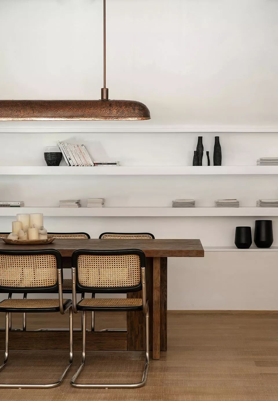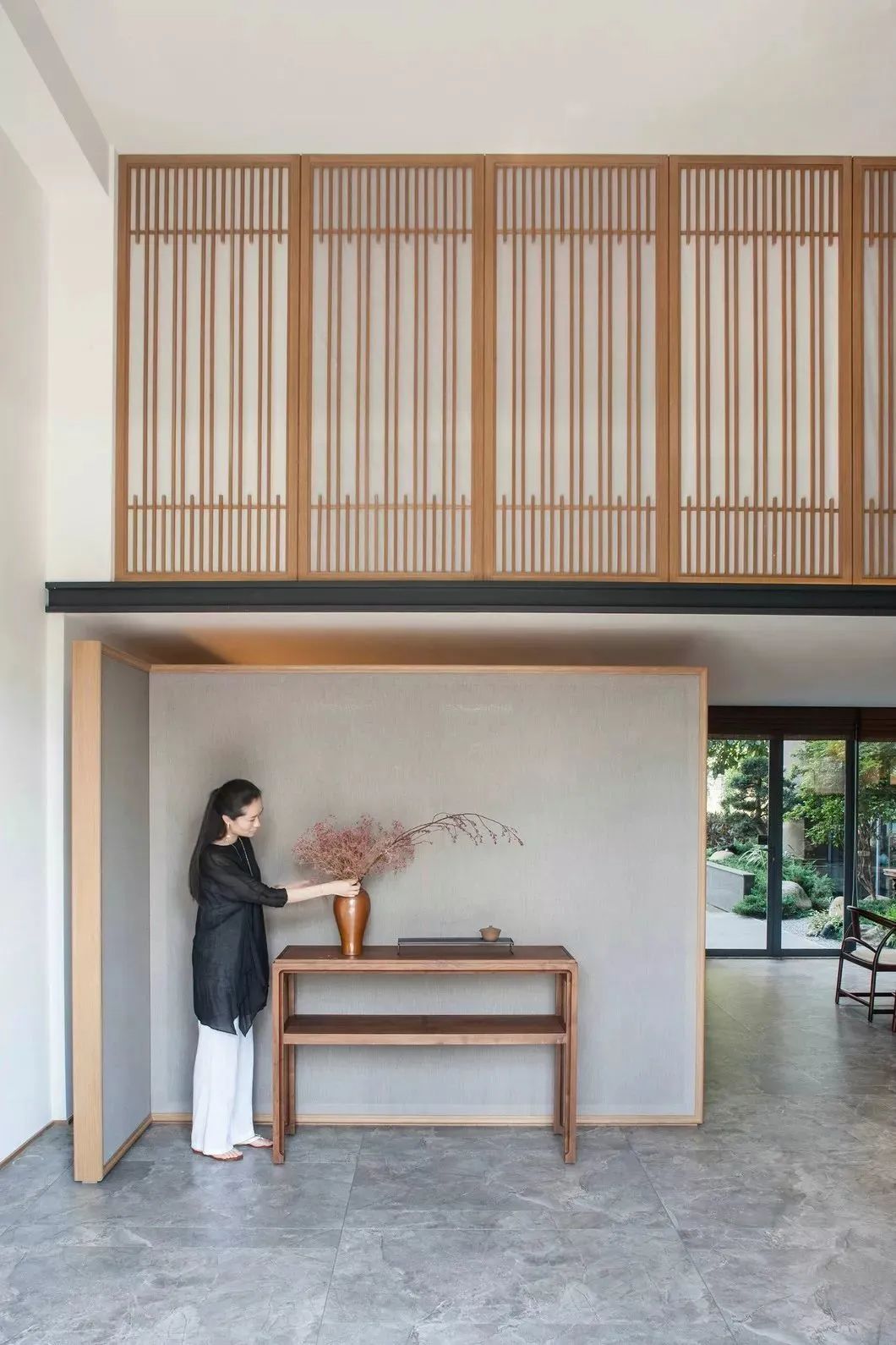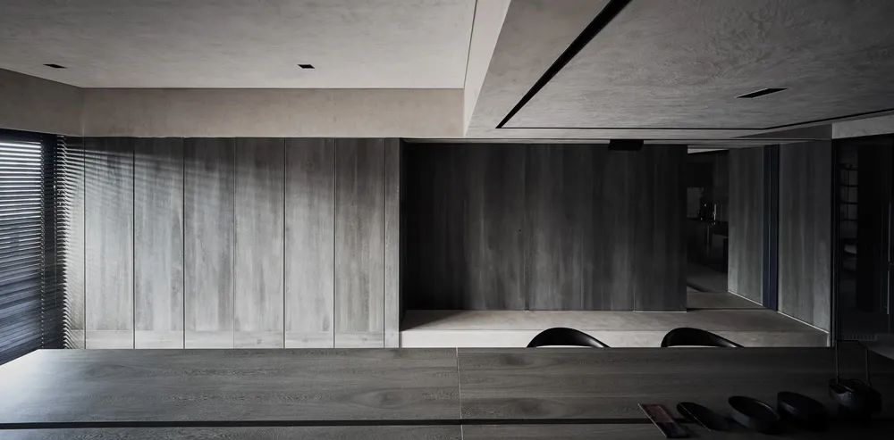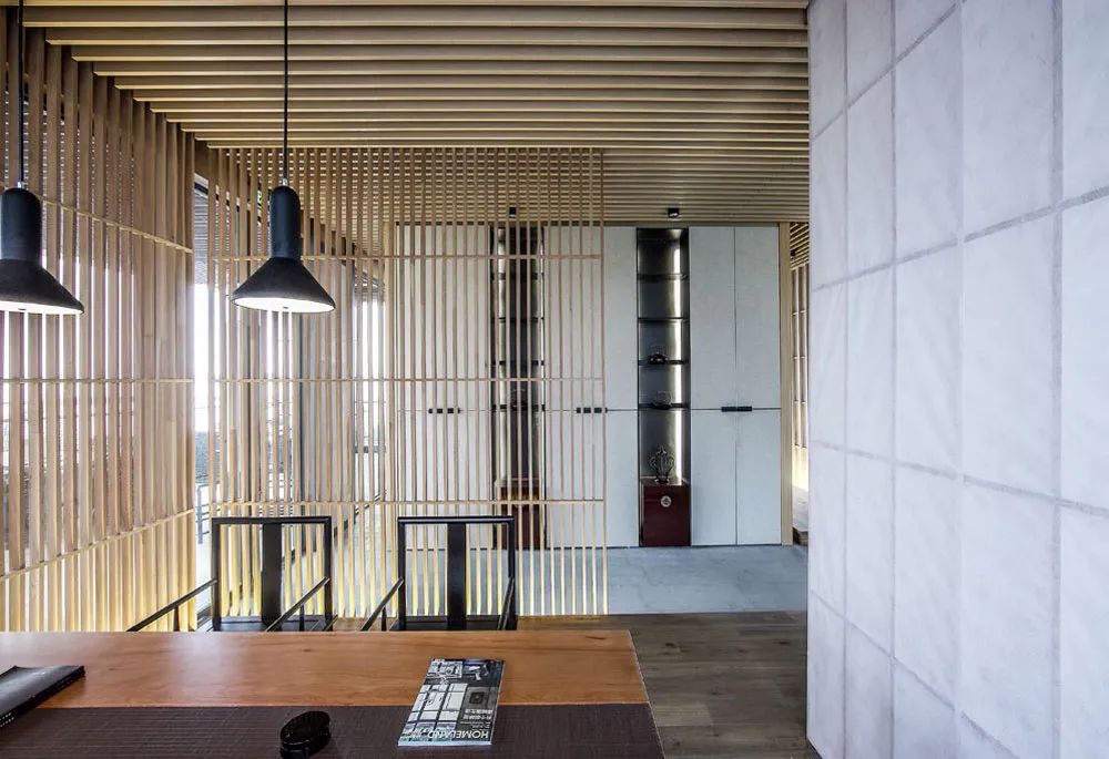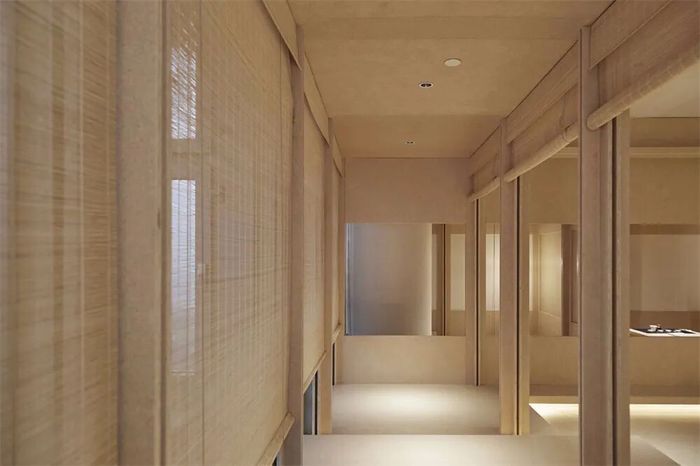 项目原始建筑结构面窄进深狭长,首层空间5.5米,空间尝试以素雅浅色铺垫空间基调。地面采用水磨石结合不规则片岩,如同安静水面,与汀步趣味舒展空间体验。定制打磨竹条,在墙面编织肌理,在光影的互动下婆娑。