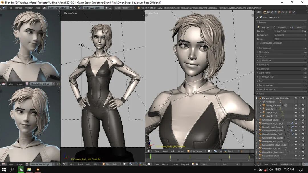 Yuditya Afandi从2015年开始接触并学习3D艺术,主要是学习书籍和各种网站的教程,他的灵感来源包括迪士尼和超级英雄电影,以及各种游戏和动漫,所以不少作品都是粉丝艺术,创作时他主要使用Blender, Zbrush, Photoshop, Marvelous Designer, Substance Painter, 以及Marmoset Toolbag等软件。