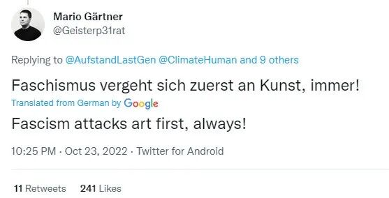 在这次行动后,其组织也在推特表明,“如果一幅沾着土豆泥的画能让社会意识到化石燃料正在杀死我们所有人,那么我们则会给世界一幅沾着土豆泥的画。”