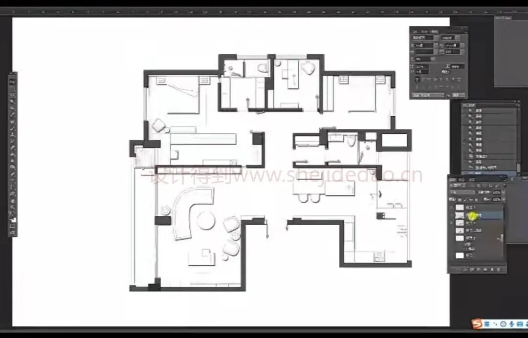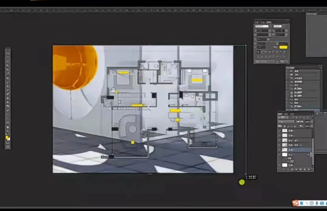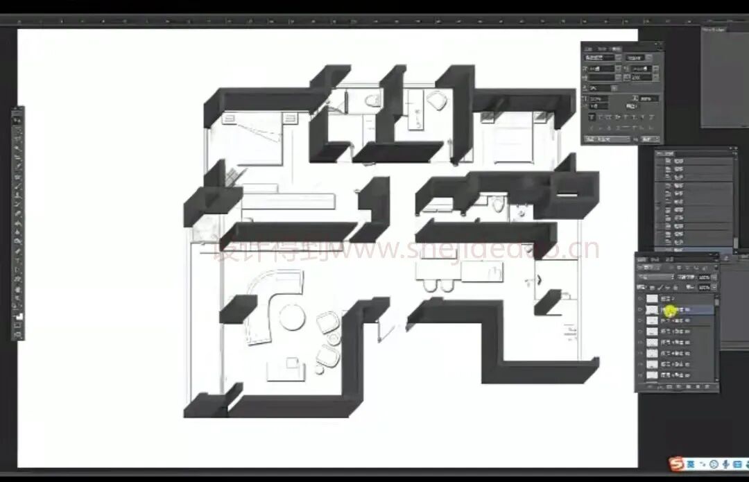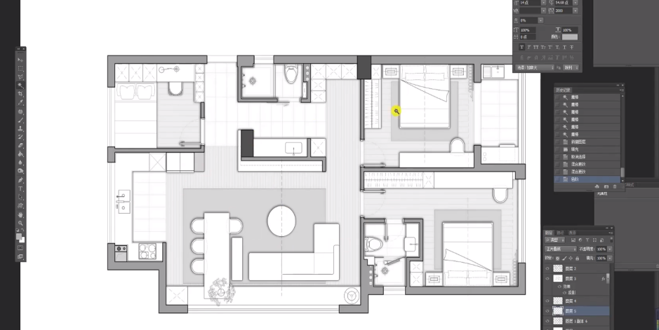 将选好的贴图,导入PS,右击转化为栅格化图像,点击卫生间、厨房、阳台区域,点击蒙版,将蒙版拖至贴图图层,关闭锁链,ctlr+T,调整大小,ctri+B,调整颜色。