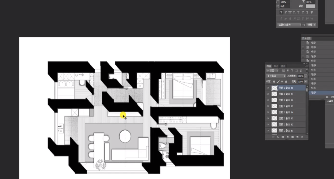 4、Ctrl+D,关闭连续,选择墙体。复制图层,快捷工具选择移动,选择复制图层,按Alt键,重复上右动作,拉出全地面投影,约至110~120,Ctrl+E进行合并。