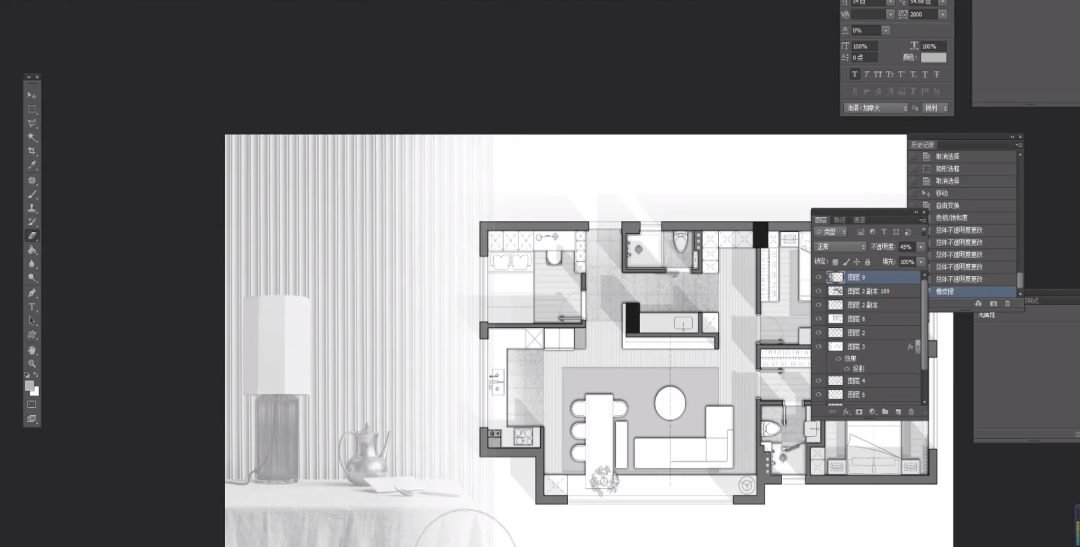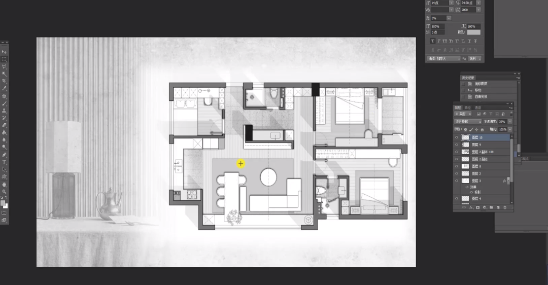 课件中纹理拖入,色相饱和度工具去色,调整不透明度矩形选框工具选择平面图的范围框选并调整羽化值delete删除选区