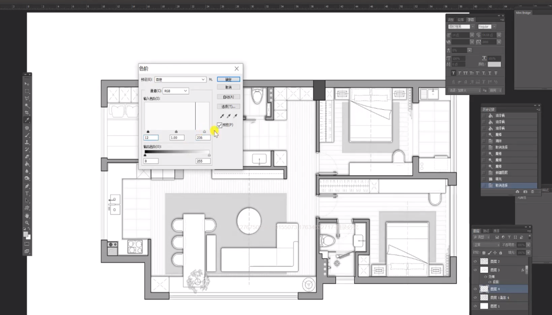 选中地毯,新建图层alt+delete。色阶工具调整颜色,比墙面淡一点。