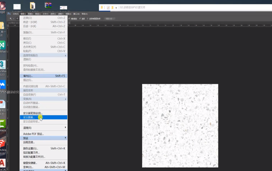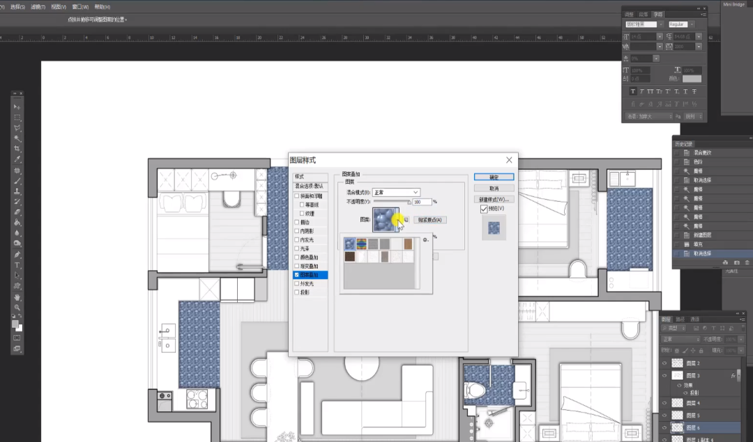 选中地砖,新建图层填充颜色,拖入课程给到的psd纹理设为定义图像。回到彩平图,打开填充图层的图层样式并添加定义图案。加深、减淡工具调整与其他物体的边缘。