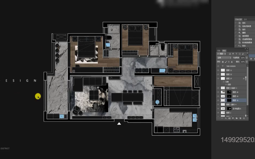将选好的贴图,导入PS,右击转化为栅格化图像,点击卧室木地板区域,点击蒙版,将蒙版拖至贴图图层,关闭锁链,ctlr+T,调整大小。