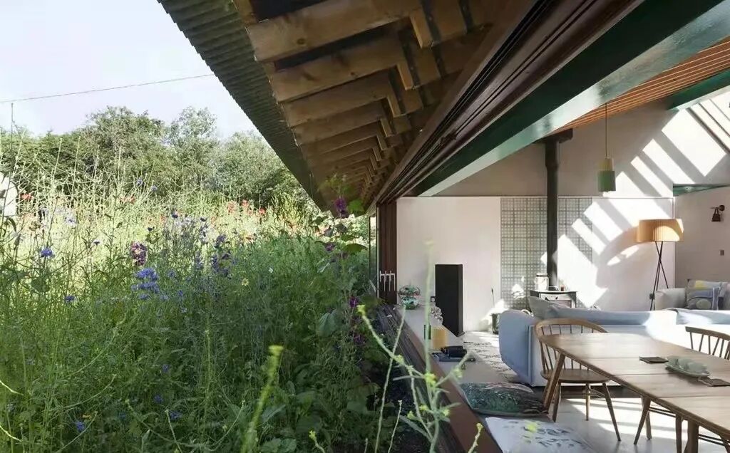 在外面,一条过渡的小路蜿蜒穿过建筑物右侧的一个小花园。向上看有大面积的玻璃,经过精心布置以最大限度地增加阳光,覆盖在房屋的右侧。还有一个高窗,可以让积聚在圆顶地板上方的热量散发出去。