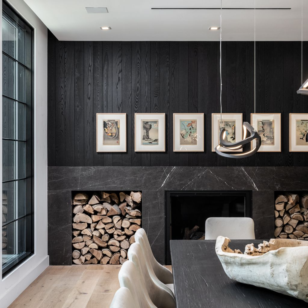 燃气壁炉背景墙选用日本特殊工艺打造而成的烧杉板,无漆无味,保留了木材清晰的纹理和脉络。