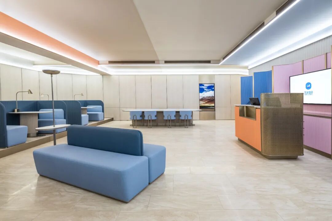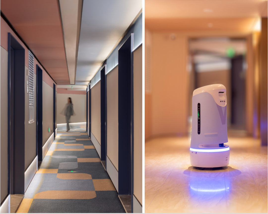 客房走廊也透过紧贴底部和天顶处的隐藏照明系统、以及清新的配色及愉悦的纹路,规避了酒店走廊常有的枯燥与幽闭,也缓释了旅途中的疲惫与压力。递送机器人的介入,不仅提高了服务效率,也更顺应疫情后时代的“无接触”倡议。
