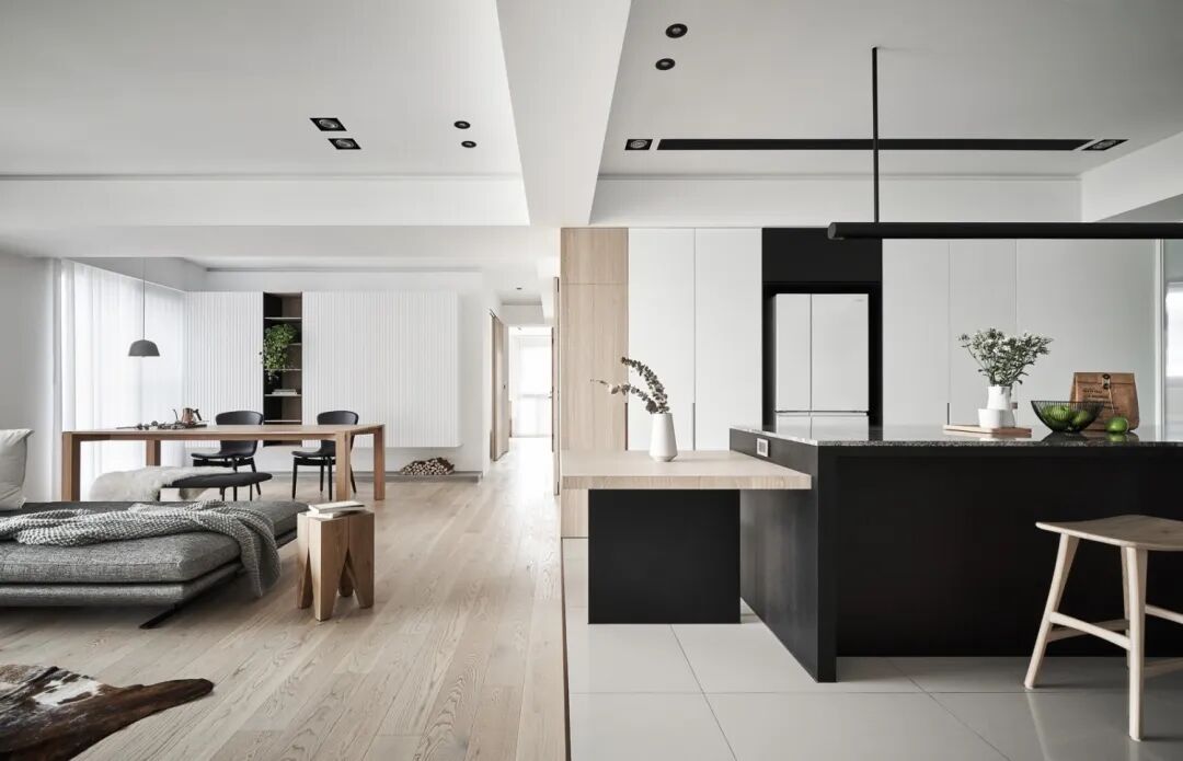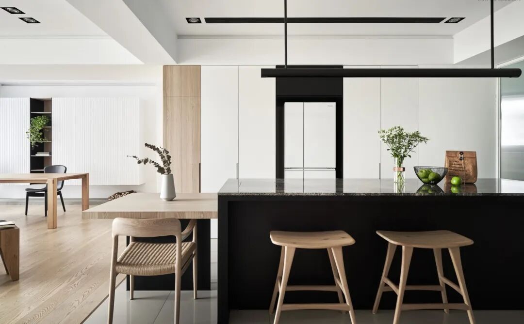 ▲餐厅的餐桌靠着中岛台布置,让餐厨空间有着更加时尚舒适的现代感。台面上的果篮与插花布置,也增加了现代自然的空间感。