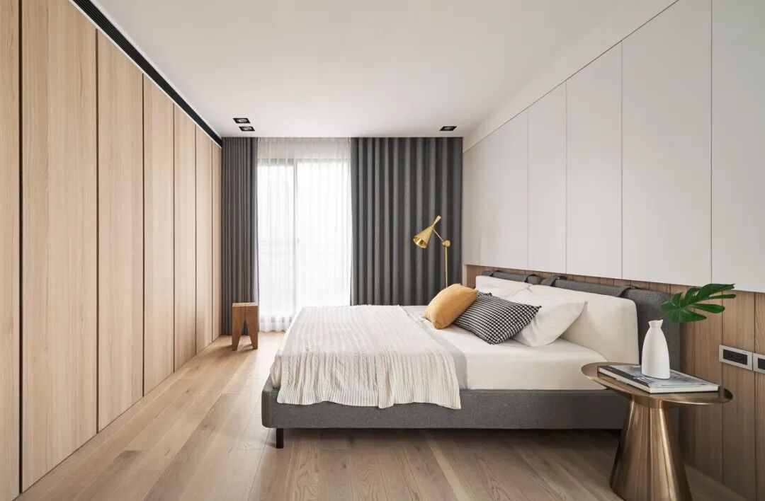 ▲卧室以简洁的无主灯空间基础,床头墙以硬包的背景质感,搭配床尾的木质感墙面定制柜,还有灰色的布艺床铺,也让卧室显得更加舒适自然。