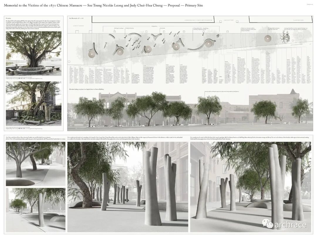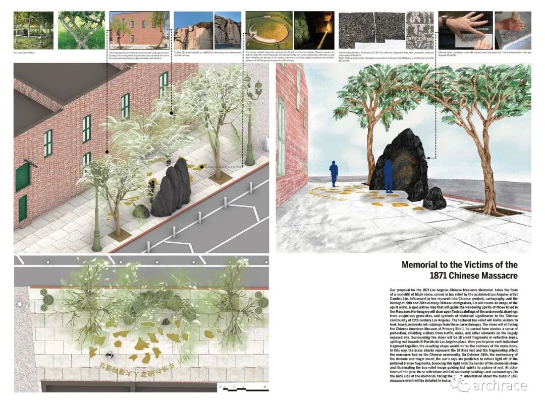 该提案着眼于更广泛的洛杉矶华裔美国人的经历,记录了他们在这个社区遭受的许多不公正。一片石化树干的丛林比喻了在大屠杀事件中的受害者。人行道上蚀刻的圆圈再现了事件过程的时间线,所有这些最终汇聚在一棵“年轻的闪光的树”下,象征着生长和希望。树根、树桩、树木、历史和记忆是这个设计的主要元素。