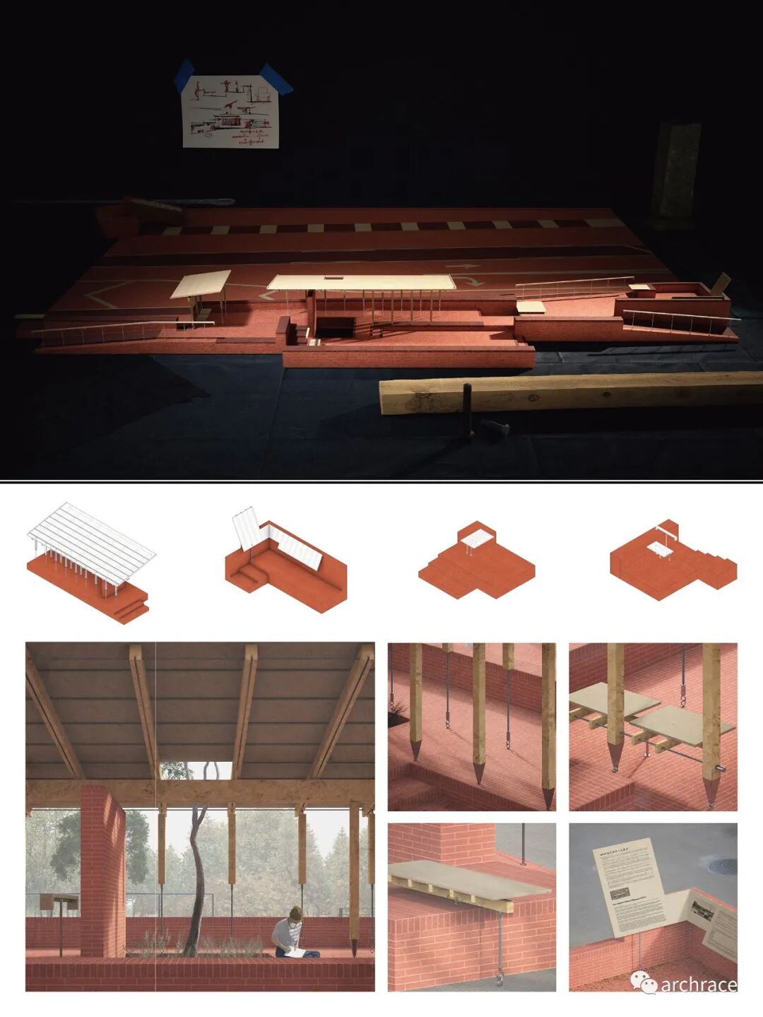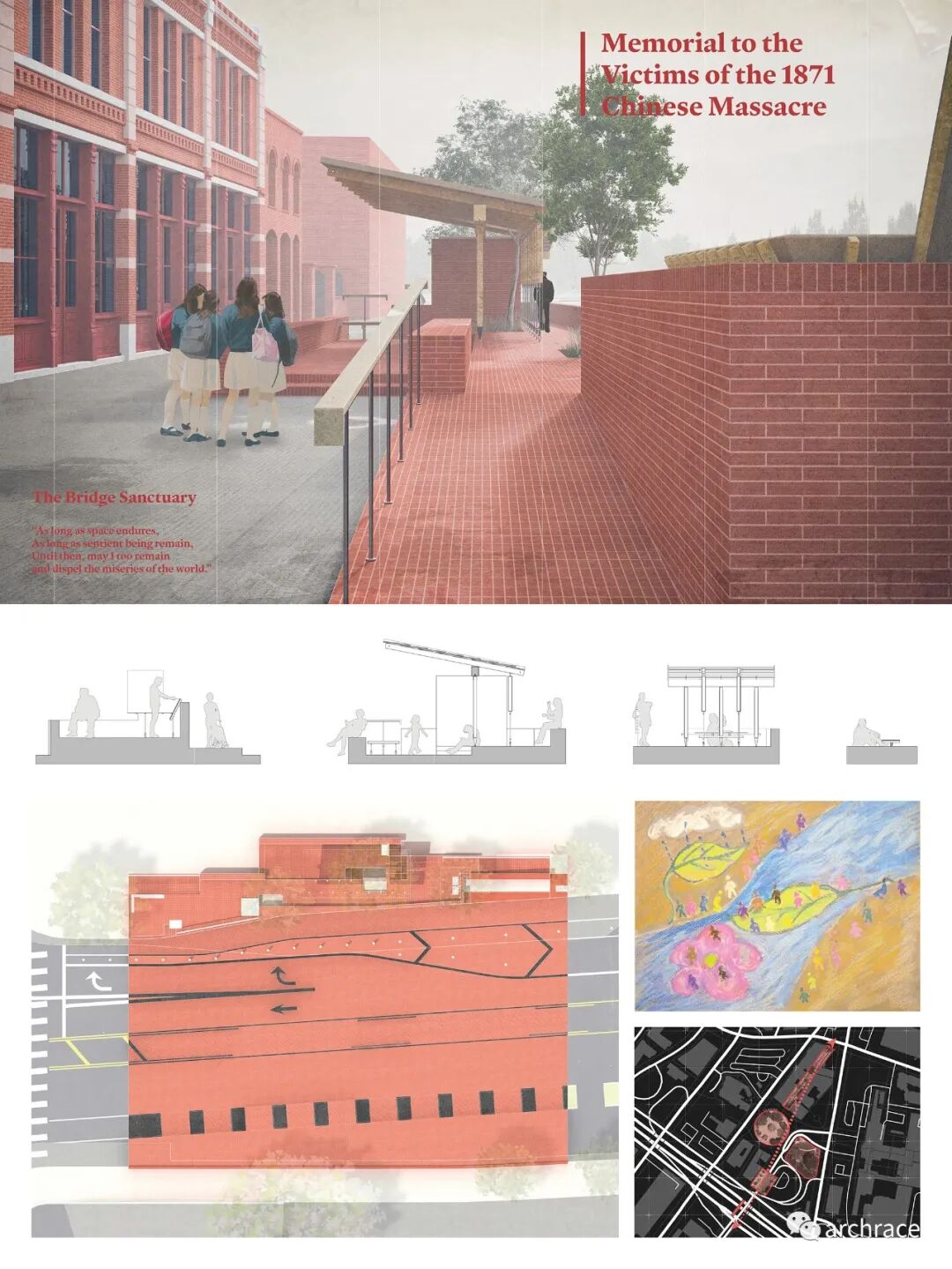 该方案设计了带有折叠屋顶的红砖木亭,邀请路人放慢脚步,沉浸在空间的历史中。支撑屋顶的柱子上刻有“1871年洛杉矶华埠大屠杀”事件遇难者的名字。
