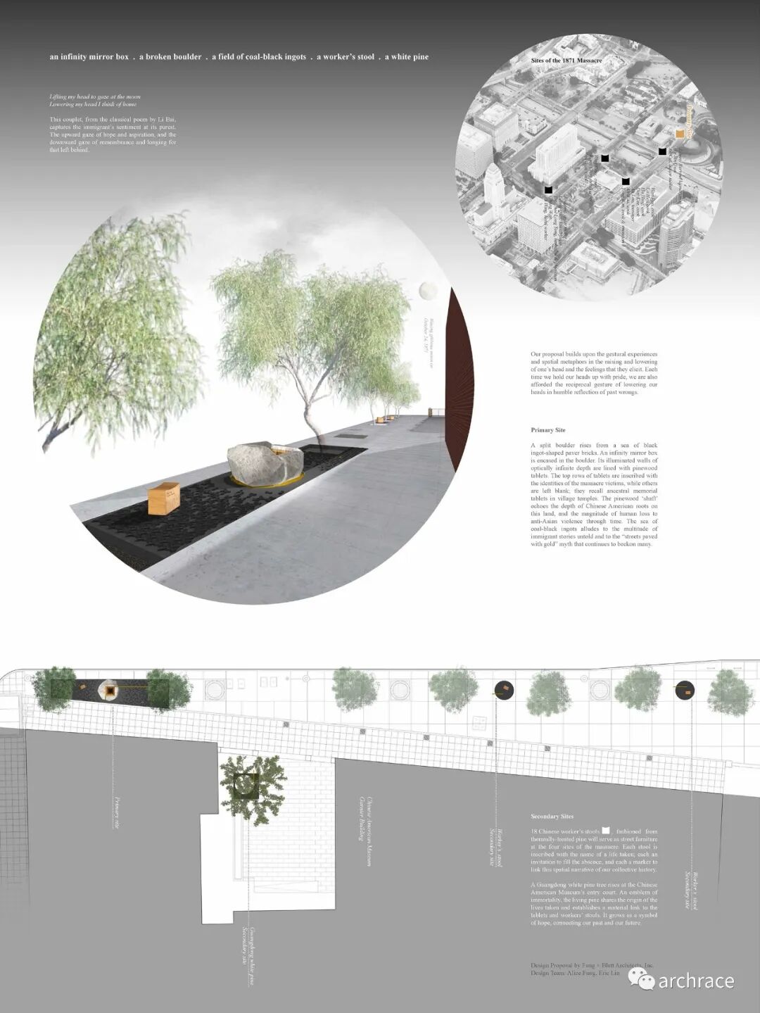 该方案的重点是增强参观者在抬头和低头的两个动作的体验及其带来的感受。一块裂开的巨石,中间装着一个呈现无限景象的镜面盒子,目的是鼓励路人低下头,作为对过去错误的谦卑反思。松木制作的竖井比喻美国华人在这片土地上的深厚根基,而黑色锭形铺路砖的海洋则暗示了无数不为人知的移民故事,以及继续吸引着许多人的“黄金铺成的街道”神话。