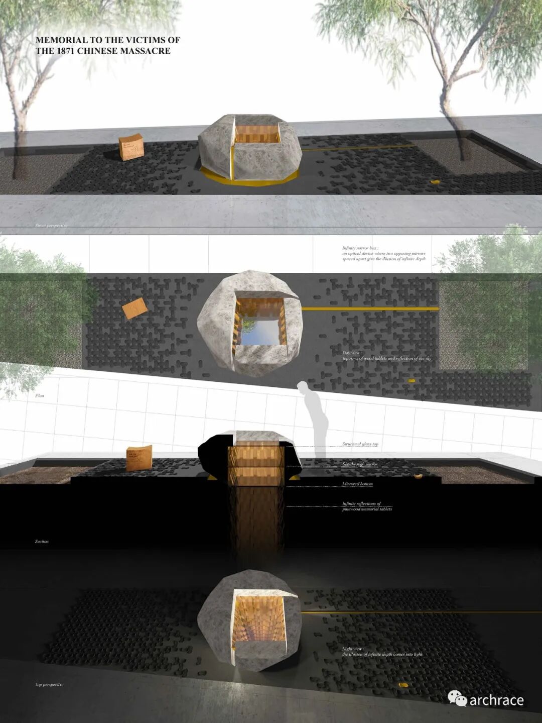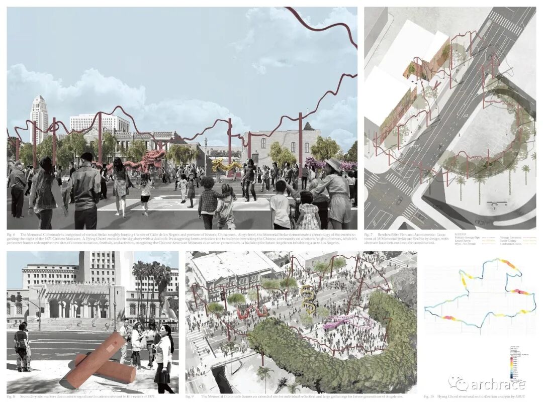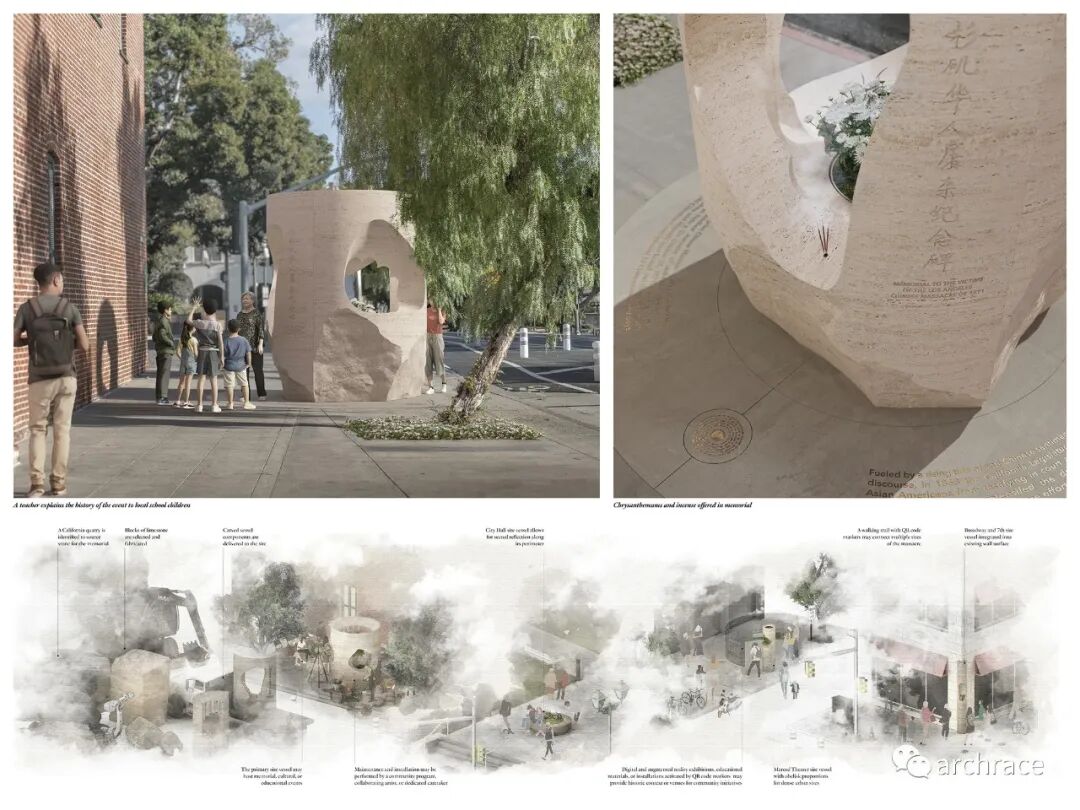 竞赛背景情况 近日,洛杉矶文化事务部 (DCA) 和 El Pueblo de Los Angeles Historical Monument 联合宣布了“1871年洛杉矶华埠大屠杀”事件官方纪念碑设计竞赛的六个入围作品。 据 DCA 总经理 Daniel Tarica 介绍,这座纪念碑将是为了纪念1871年10月24日在洛杉矶市中心美国博物馆现址附近发生的屠杀事件的18名华裔受害者。两年前,为了传达一个关于抵制暴力和种族主义的普世价值观,DCA受委托计划推行该项目。 洛杉矶市前首席设计官 Christopher Hawthorne 在9月的一次预演中说:“我们希望这座纪念碑既能纪念1871年的历史事件,也能反映当代社会对这一事件的共鸣。我们希望它能自觉地、巧妙地做到这一点。我们非常清楚我们的关注点,不想掩盖这个纪念碑和其他所有纪念碑一样,不仅要讲述过去,而且要讲述它的设计时刻的这样一个事实。” 每个入围团队都将获得15,000美元的奖金,以进一步深化他们的方案,并在下个月进行公开展示。由 Hawthorne、Annie Chu、Mark Lee 和其他六位与社区有联系的艺术专业人士组成的评估小组届时将做出最终决定。