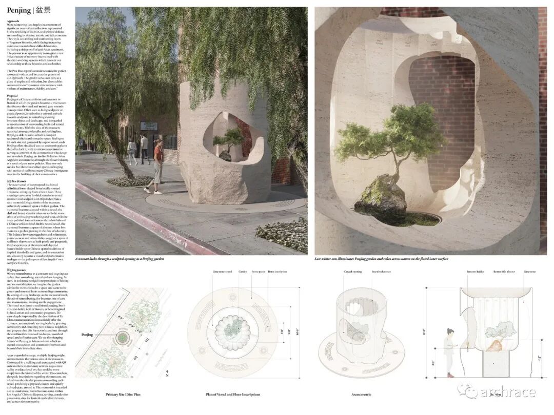 这项提案以盆景为核心概念,盆景是中国传统的一种艺术形式。在盆景中,花园景观成为了一个缩影。它的焦点在于对内省的视觉和心理凝视。纪念碑被想象成一个活生生的雕塑,体现了一种文化态度,将雕塑视为存在于物体和景观之间的东西。每个盆景都为不起眼的地方提供仪式化的关怀,微观内部反映了设计和维护它的社区。这样做的目的是反映许多中国移民在社区建设中所追寻的坚韧不屈的故事。