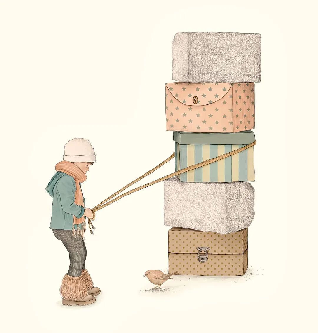 据这位艺术家介绍,她的插画作品灵感主要来源于童年的美好回忆,通过一些记忆片段,再将它们用绘画语言表现出来,创作出这些适合于儿童和成人的插画作品,儿童会在这些插画中获得快乐,而成年人会在这些插画作品中收获到回忆。
