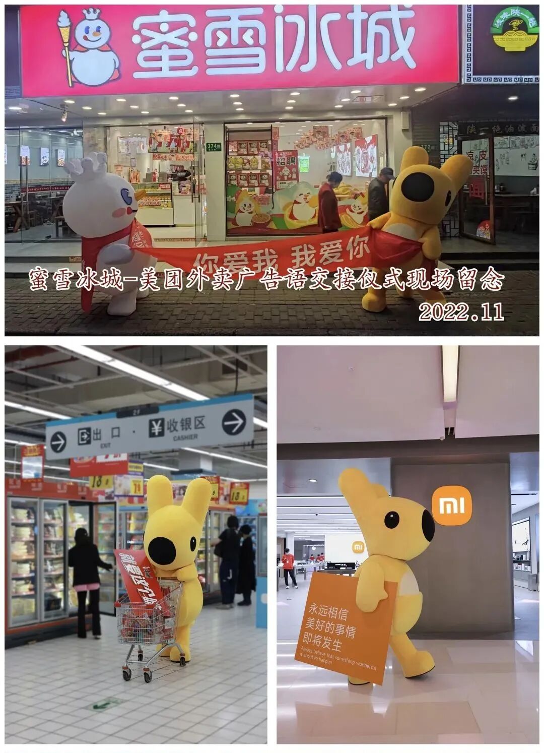 还有一件好玩的事情,据说跟各大品牌“借广告语”的过程,是由美团外卖的小袋鼠跑到各品牌门店完成的,还留下了广告语交接仪式纪念照。