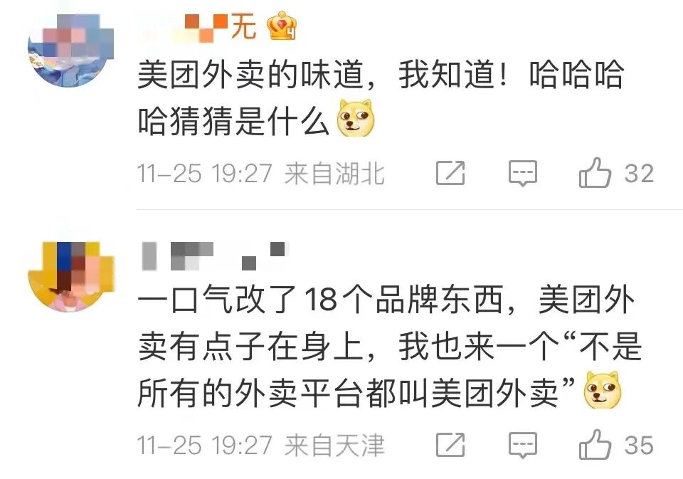 18个品牌slogan中的品牌名,更换为“美团外卖”,借用各大品牌影响力,最大化撬动传播势能。填空式的slogan更换,还引发了网友的续写。