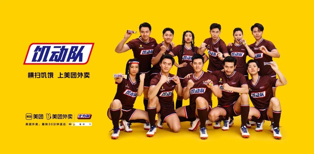 海报通过不同的球队合影,呈现球迷众生相。每一张海报,模特都穿着联合品牌的特色球衣,并拿出对应产品,让用户直观感受到品牌利益点,其实也与美团外卖的垂直人群画像一一对应。同时这波品牌联合,还借助了slogan组合的玩法,增加球迷与美团外卖平台的生活连接点。