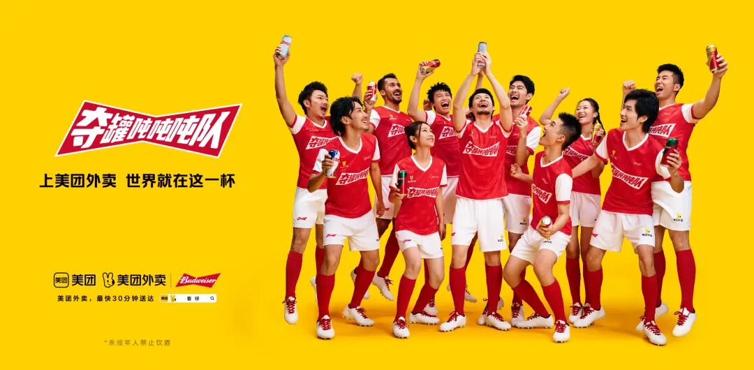 啤酒跟足球当然是绝配,美团外卖联合百威啤酒赞助“夺罐吨吨吨队”,用啤酒罐谐音梗,祝你支持的球队夺冠!
