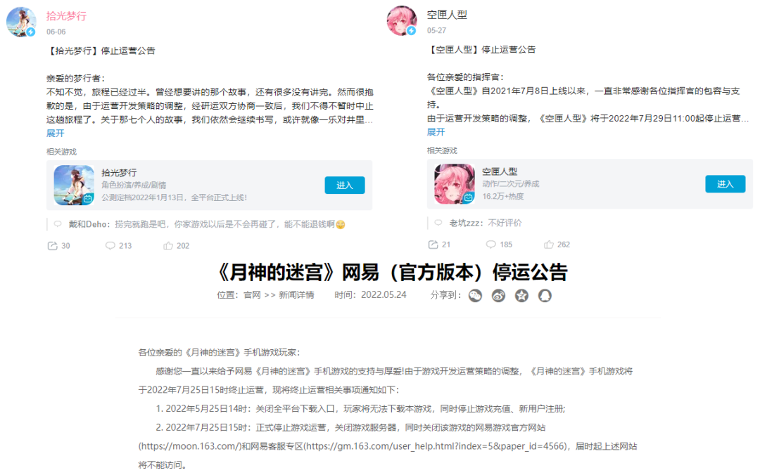 网易代理的《月神的迷宫》于2021年7月27日上线,5月24日宣布7月25日停运;B站代理的三款产品,2021年7月8日上线《空匣人型》于今年5月27日宣布7月29日停运、2022年1月12日上线的《拾光梦行》于今年6月6日宣布8月8日停运、2019年11月19日上线的《双生视界》于今年6月7日宣布6月后不再更新。