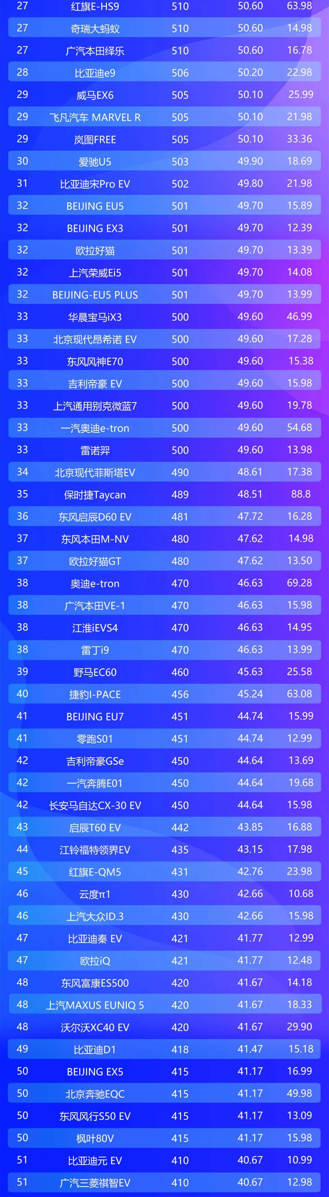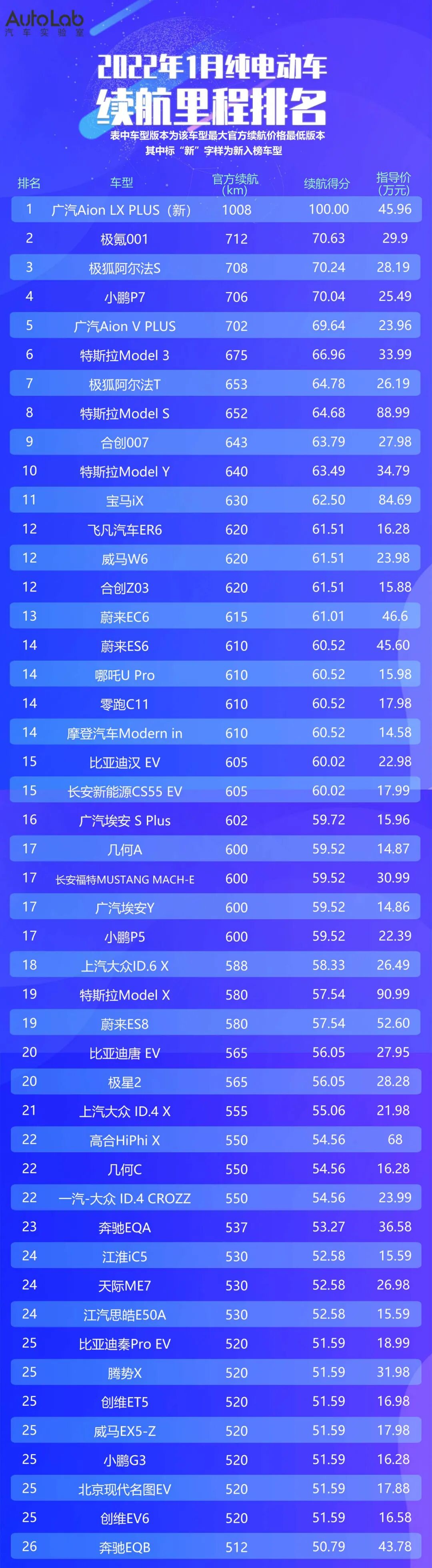广汽埃安LX PLUS的续航里程达到了1008公里,这也是首款在工信部记录的续航里程达到1000公里的电动车。而刚刚上榜不就的极氪001也正式退居第二名。