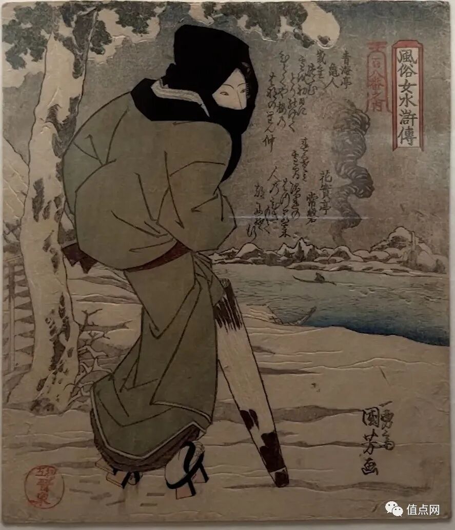 歌川派之中,歌川国芳以武者画作闻名,其中尤以「水浒传豪杰百八人」系列为人熟悉。原来在「正常版本」以外,这位大师也绘画了「风俗女水浒传」。今次展出的一幅,主角便是八十万禁军教头 - 林冲。