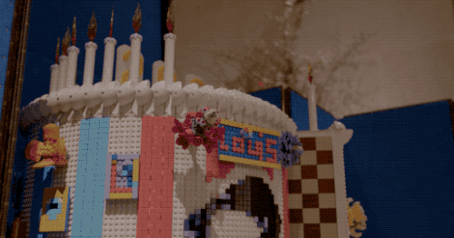 蛋糕模型使用Louis Vuitton经典旅行箱妆奁,打开时极富仪式感,下层的抽屉刚好容纳生日蜡烛与火焰元素的积木,白手套的小心谨慎与孩子们组装时的欢快随意形成鲜明对比,这大概就是成长的代价吧。