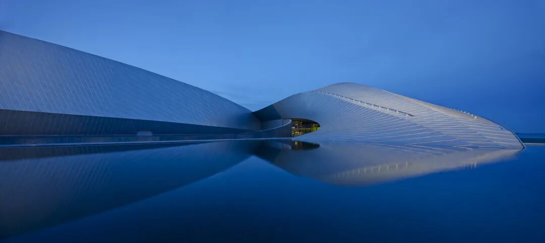 位于哥本哈根郊外的蓝色星球水族馆是一座抽象的建筑,其建筑形式毫不费力地体现了功能,仿生形式的设计类似于漩涡,代表了海洋生物的有机性质,不断变化的丹麦天气改变了其瓦状的外观,而厄勒海峡两岸冰冷的海水则反射并照亮了建筑。