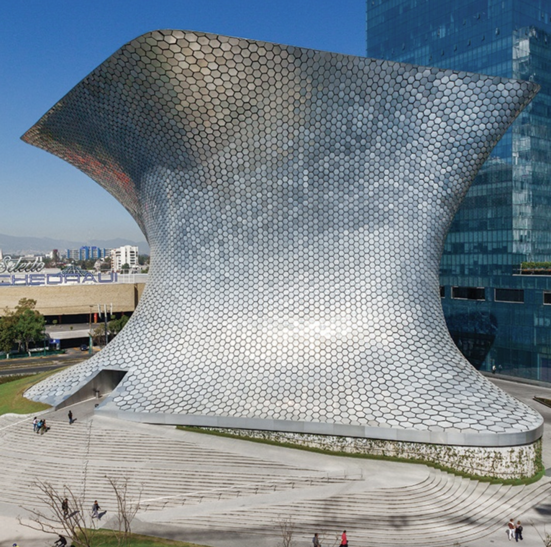 苏玛雅博物馆是大量私人艺术收藏品的所在地,博物馆是一个旋转的菱形,坐落在一个旧轮胎厂的遗址上,它的资助和设计旨在为公众和墨西哥城更广阔的景观创建一个新的文化机构。