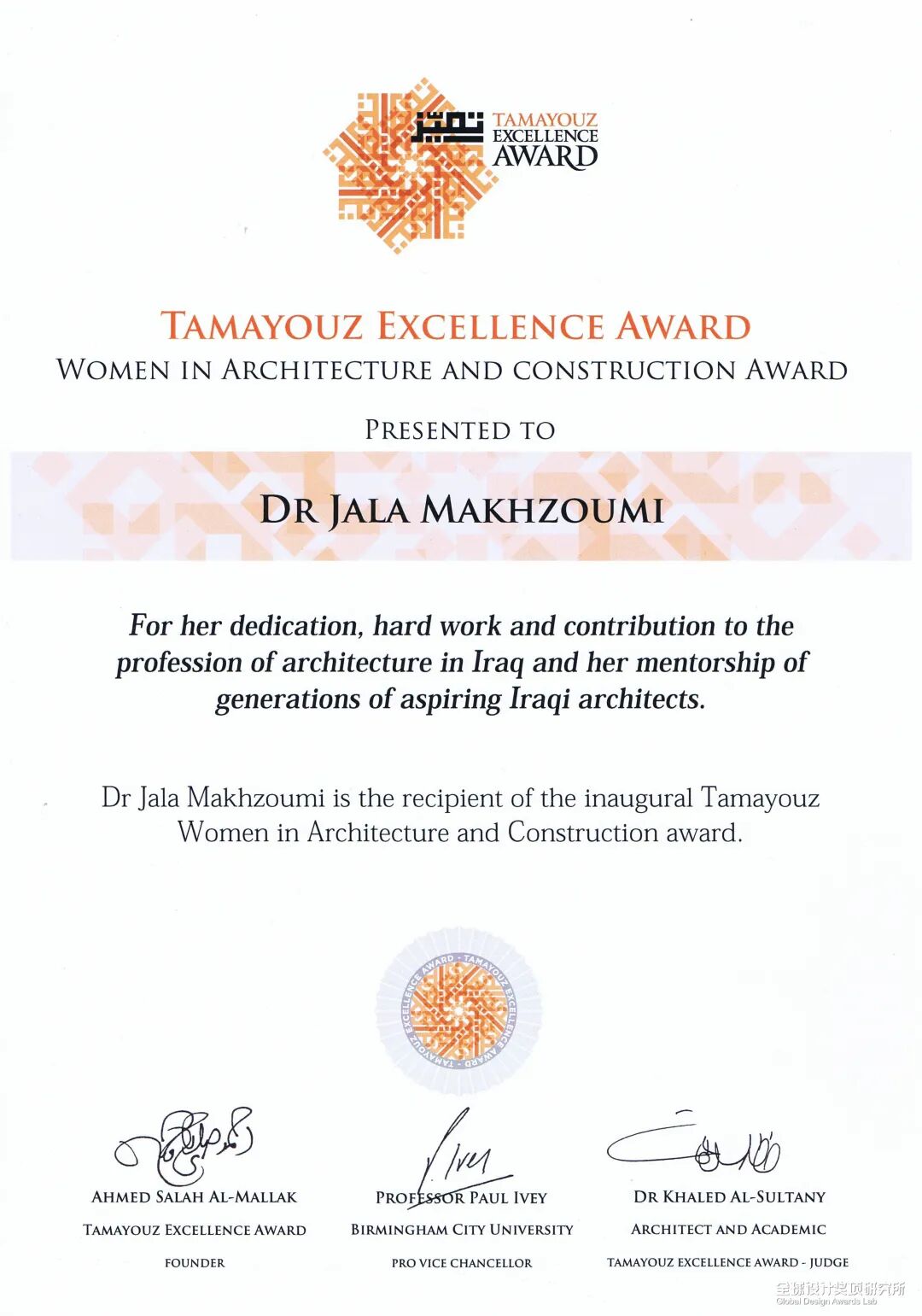 2013年,Jala博士被授予塔马尤兹卓越奖(Tamayouz Excellence Award)