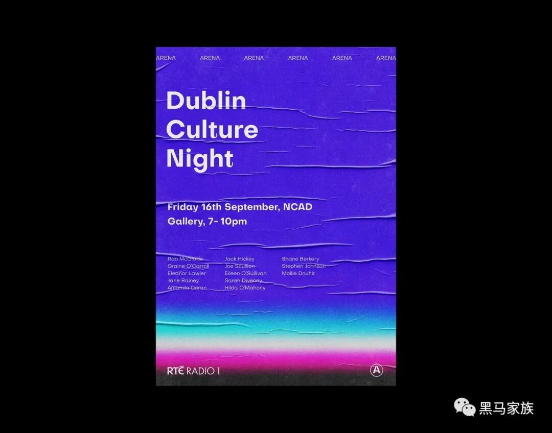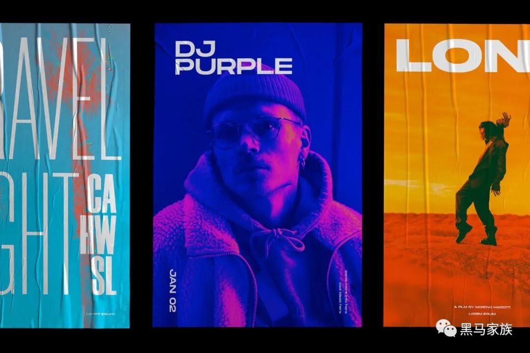【Demo】海报:在此类线框海报中,使用高饱和渐变,可以快速在文字中形成焦点,纯黑的空洞背景也因此有了高级感、可读性,打造出厂牌形象标。
