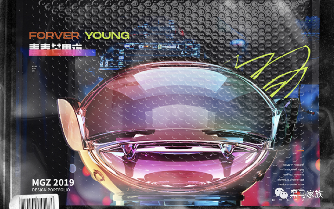 【Demo】海报:重复式构图+酸性材质感的主体,毫无疑问是未来色的典型运用,往往不需要高饱和的冲击色,用3D金属为载体,流光的色彩打造科技迷幻感,透明感、未来感十足。
